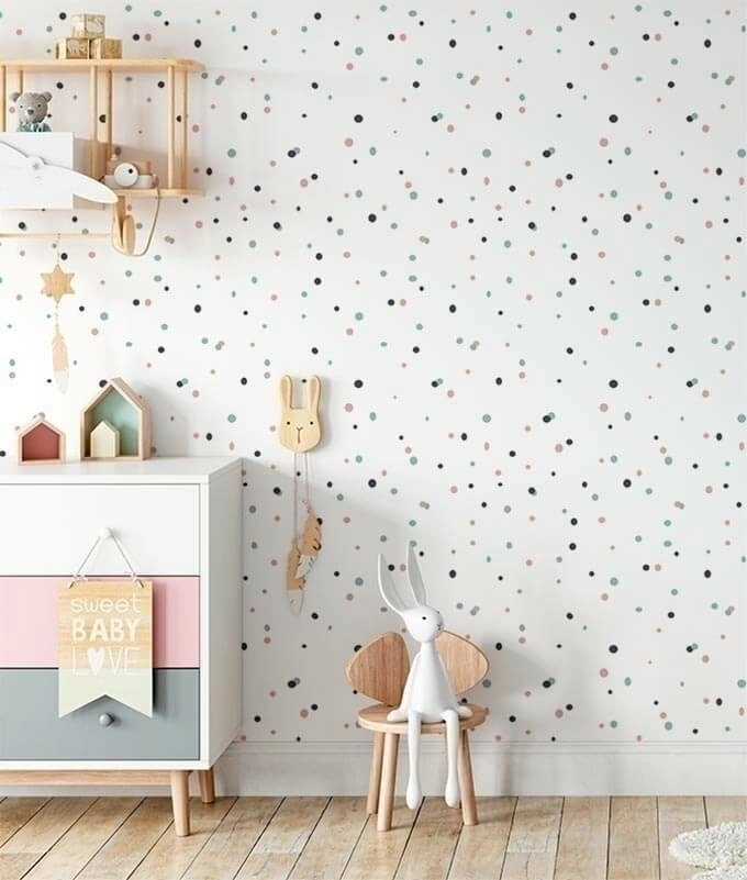 O Papel de parede Poá é super divertida e leve. Perfeito para uma decor mais tranquila, atemporal e unissex.